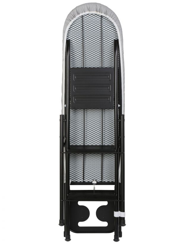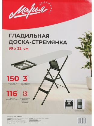 Модель легко трансформируется: используйте как гладильную поверхность (99x32 см) или как стремянку с тремя ступенями, максимальная высота — 116 см. Прочная металлическая столешница выдерживает ежедневные нагрузки.
