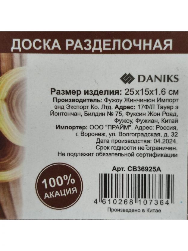 Доска разделочная акация, 25.5х15х1.6 см, с ручкой, прямоугольная, Daniks, CB36925A