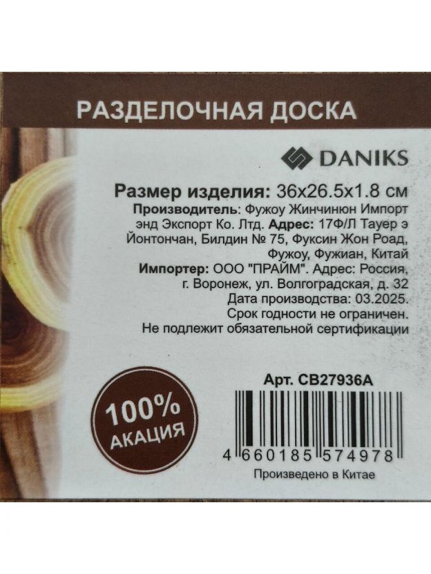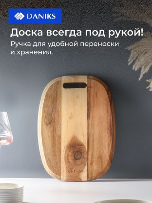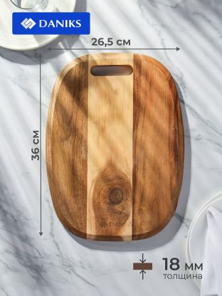 Доска разделочная акация, 36х26.5х1.8 см, с ручкой, прямоугольная, Daniks, CB27936A