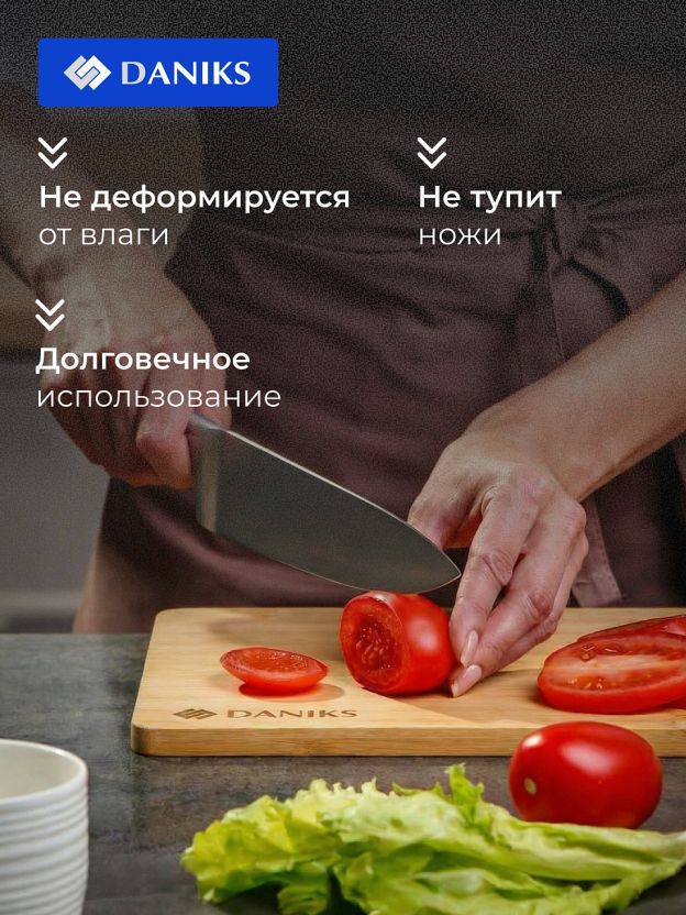 Разделочные доски из бамбука Daniks — выбор для тех, кто ищет купить недорого набор досок для дачи или дома с гарантией безопасности и долговечности. Бамбук — натуральный материал, который не тупит ножи и не впитывает влагу, что снижает риск размножения бактерий. Такой набор подойдёт для ежедневного использования: большая доска для мяса, средняя — для овощей, маленькая — для фруктов или закусок.