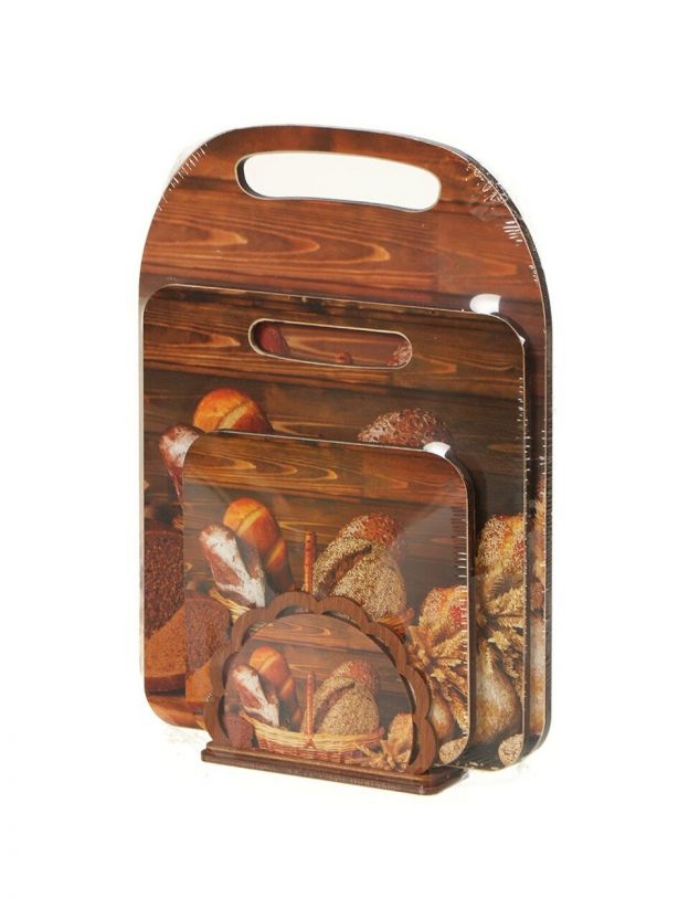 Набор состоит из подставки и трех разделочных досок прямоугольной формы.