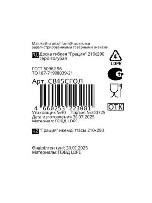 Разделочная доска Martika Грация 29х21 см — практичное решение для кухни, где ценится удобство и стиль. Серо-голубой цвет гармонично впишется в современный интерьер, а прямоугольная форма подойдет для нарезки мяса, рыбы, овощей, фруктов и хлеба. Гибкая и двухсторонняя поверхность позволяет комфортно готовить разные продукты, а возможность мытья в посудомоечной машине экономит время.