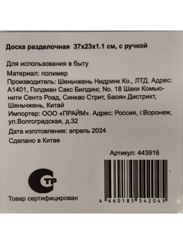 Доска разделочная пластик, 37х23х1.1 см, с ручкой, прямоугольная, Y4-7220