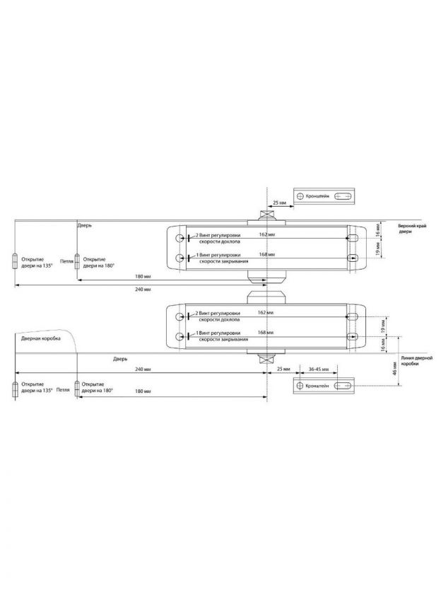 • Модель подходит для дверей весом до 120 кг при угле открывания 135°С и для дверей весом 60-85 кг при угле открывания 180°С.