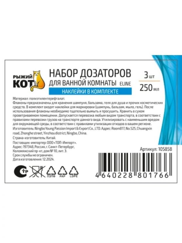 Дозатор для ванной комнаты, Рыжий кот, Eline, пластик, 250 мл, набор 3 шт, 105858