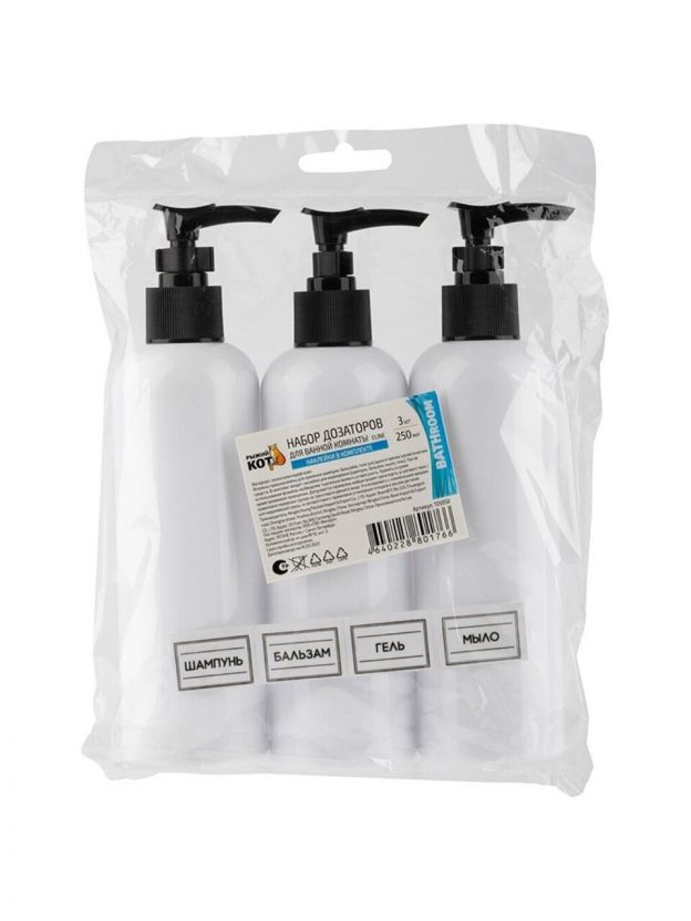 Дозатор для ванной комнаты Рыжий кот Eline — стильное и практичное решение для поддержания порядка и уюта. Набор из 3 дозаторов объемом 250 мл идеально подойдет для хранения жидкого мыла, шампуня или геля для душа. Белый цвет гармонично впишется в любой интерьер ванной комнаты. Удобная комплектация позволит разместить все необходимые средства под рукой.