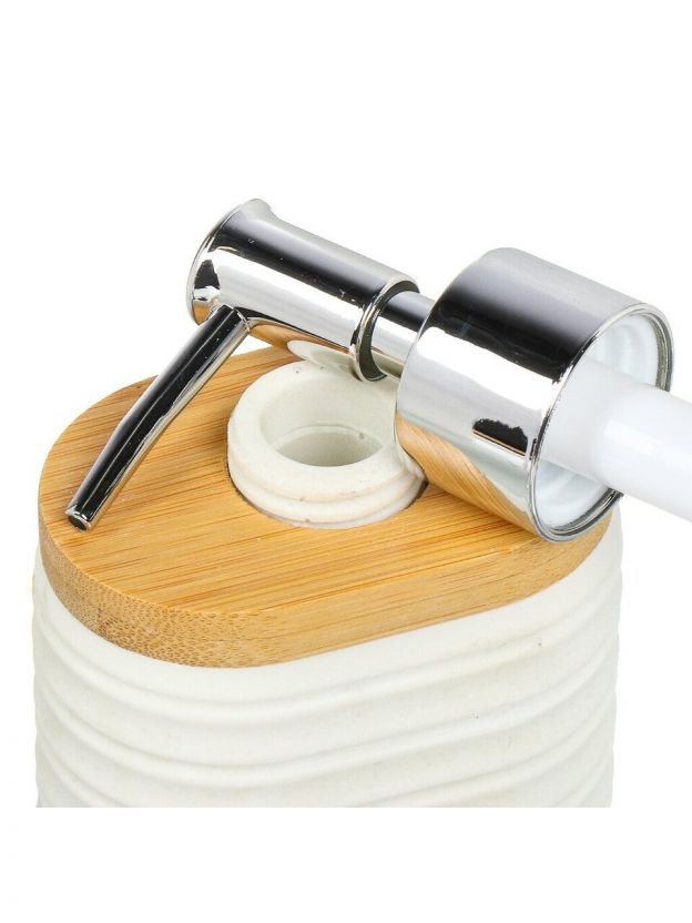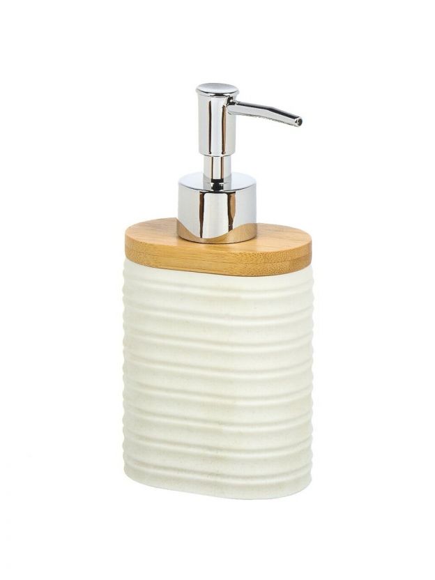 Дозатор для жидкого мыла имеет стильный дизайн и выполнен из бамбука и пластика. Он компактен и удобен в использовании, а также обеспечивает экономию жидкого мыла.
