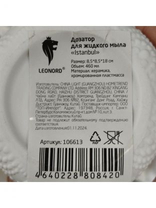 Дозатор для жидкого мыла, Leonord, Istanbul, керамика, 8.5х8.5х18 см, 460 мл, 106613