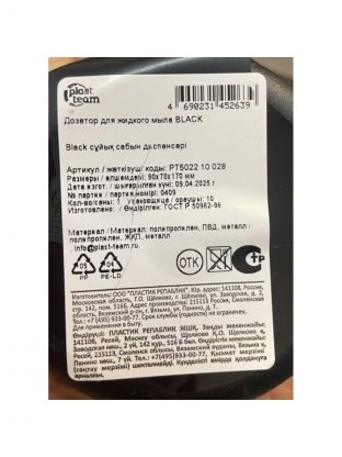Дозатор для жидкого мыла, Plast team, Black, пластик, 9х7.8х17 см, 330 мл, черный