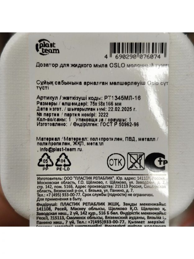 Дозатор для жидкого мыла, Plast team, Oslo, пластик, 7.5х5.8х16.6 см, 300 мл, молочный туман