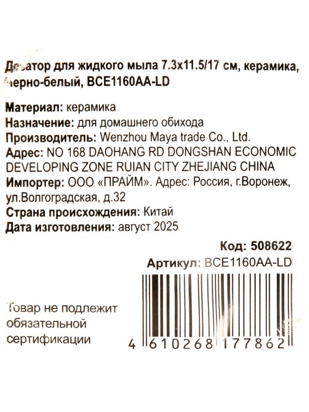 Дозатор для жидкого мыла для ванной и душа, Черно-белое, керамика, 7.3х11.5/17 см, BCE1160AA-LD
