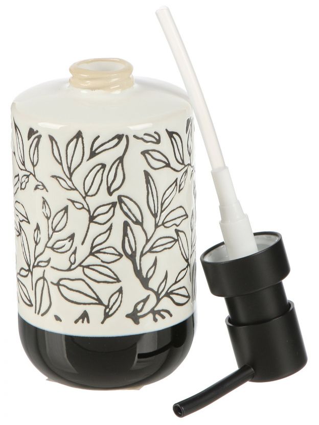Стильный керамический дозатор для жидкого мыла: лаконичный черно-белый дизайн, компактный размер и долговечность для ванной или душа.