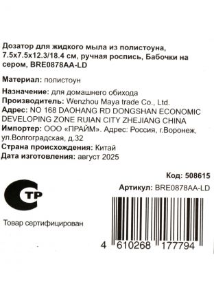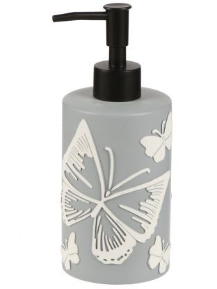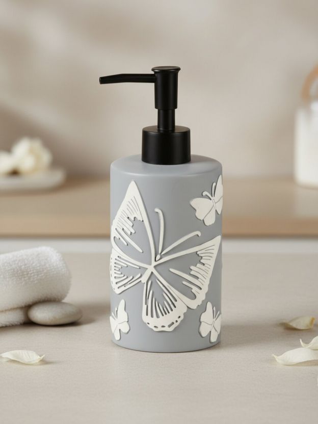 Дозатор для жидкого мыла из полистоуна с ручной росписью «Бабочки на сером»: стильный акцент для ванной или кухни, долговечность и эксклюзивность по доступной цене.