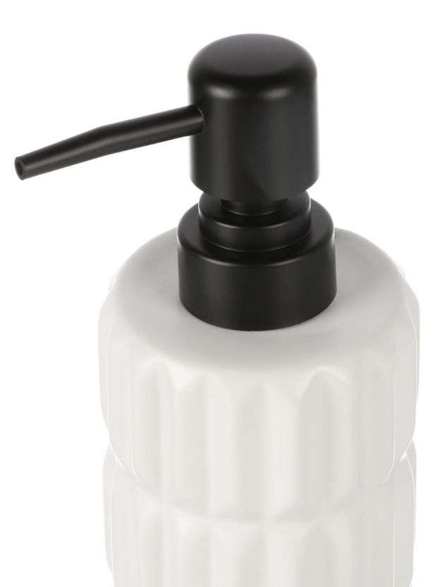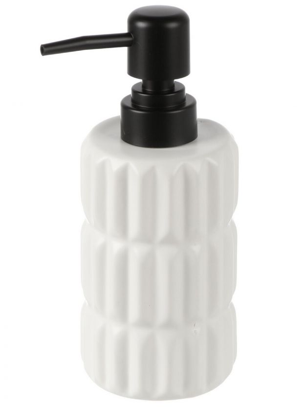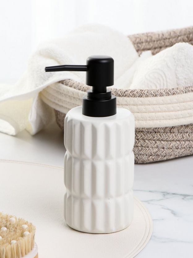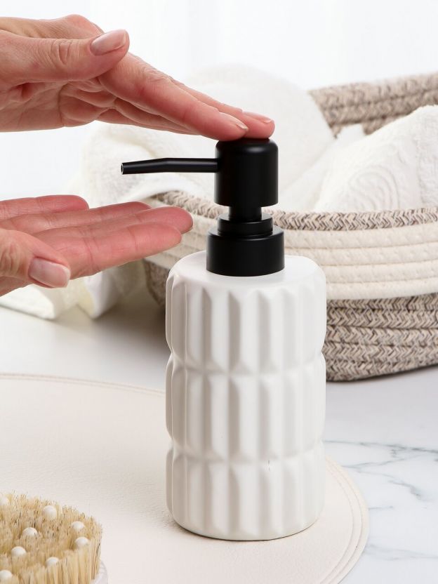 Дозатор выполнен из прочной керамики, размеры 7х7х17,5 см. Подходит для стандартных объёмов жидкого мыла, геля для рук или антисептика.