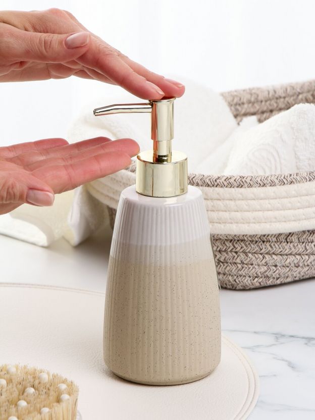 Дозатор для жидкого мыла Y4-9878 — оптимальный выбор для тех, кто ищет сочетание эстетики и функциональности. Керамическая основа с текстурой бежевого камня делает аксессуар устойчивым к царапинам и простым в уходе. Если вы ищете, какой дозатор лучше выбрать для частого использования или для ванной в стиле минимализм, обратите внимание на этот вариант: он не впитывает запахи, легко моется, не желтеет со временем.