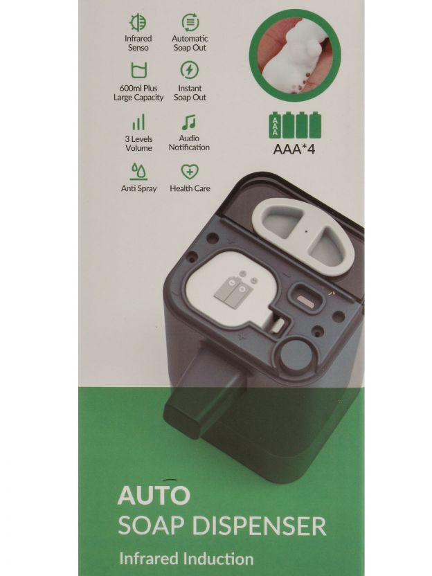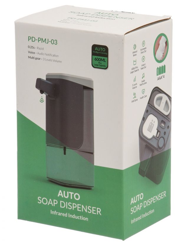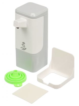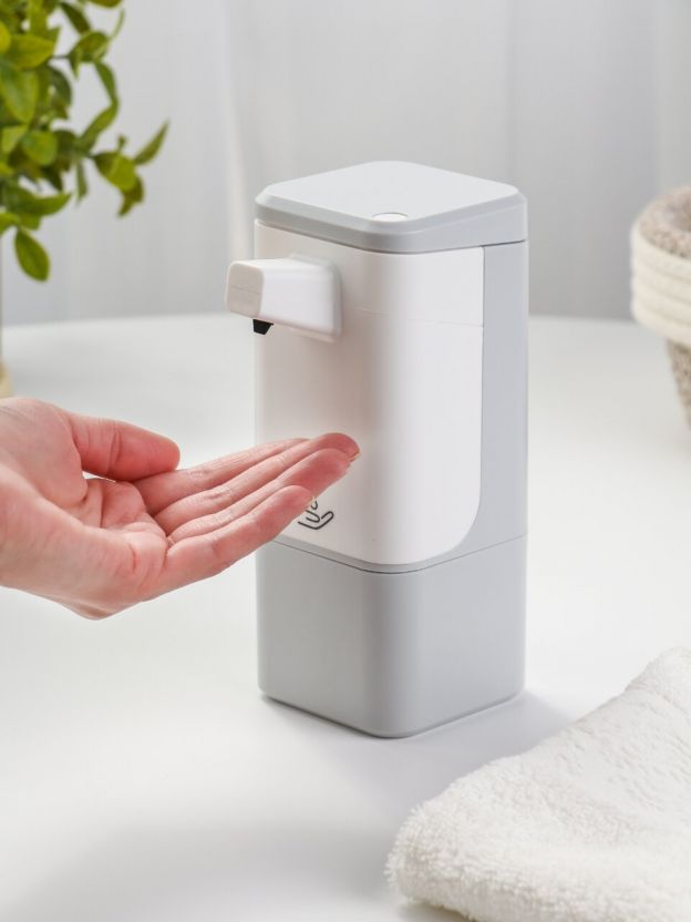 Встроенный инфракрасный сенсор реагирует на движение руки на расстоянии 3-5 см и автоматически подаёт порцию пены. Ёмкость — 0.6 л, корпус — пластик, размеры — 7.3х7.3х18 см.
