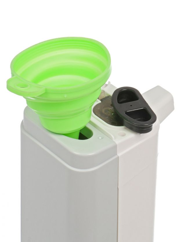 Объём резервуара — 0.6 литра. Габариты: 7.3х7.3х18 см. Лёгкий пластиковый корпус подходит для размещения в ванной, на кухне или в офисе.