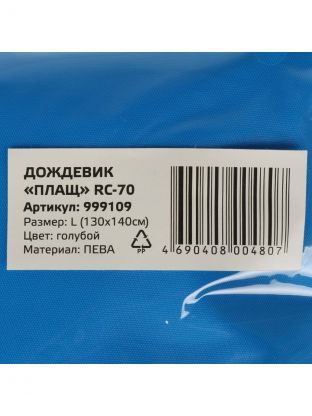 Дождевик 130х140 см, с капюшоном, кнопки, ПЕВА, L, голубой, RC-70, 999109