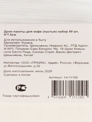 Дрип пакеты для кофе, пустые, бумага, 9х7.5 см, 50 шт, Y4-11192