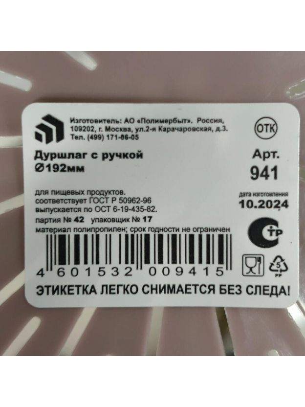 Дуршлаг пластик, 19.2 см, с ручкой, в ассортименте, Полимербыт, 4394100