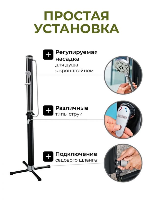• Установка очень проста, так как все необходимые детали входят в комплект поставки. Закрепите душ на основании, и вы готовы разместить душ в любом месте. При желании его также можно прикрутить к полу.