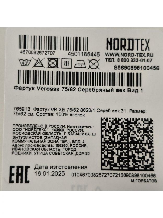 Фартук 62х75 см, 100% хлопок, без кармана, Verossa, Серебряный век Вид 1, 765913