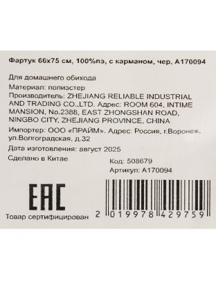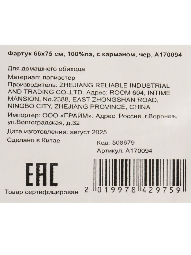 Фартук 66х75 см с карманом из 100% полиэстера — надежная защита для кухни и мастерской. Черный цвет, универсальный размер, долговечность.