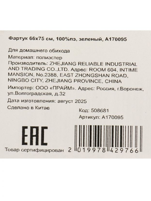 Фартук выполнен из 100% полиэстера, что обеспечивает прочность, влагостойкость и лёгкий уход.