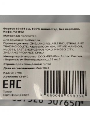 Фартук 69х84 см, 100% полиэстер, без кармана, Кофе, Y3-842