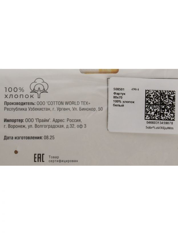 Фартук выполнен из 100% хлопка, не содержит синтетических добавок, подходит для людей с чувствительной кожей и аллергиков.