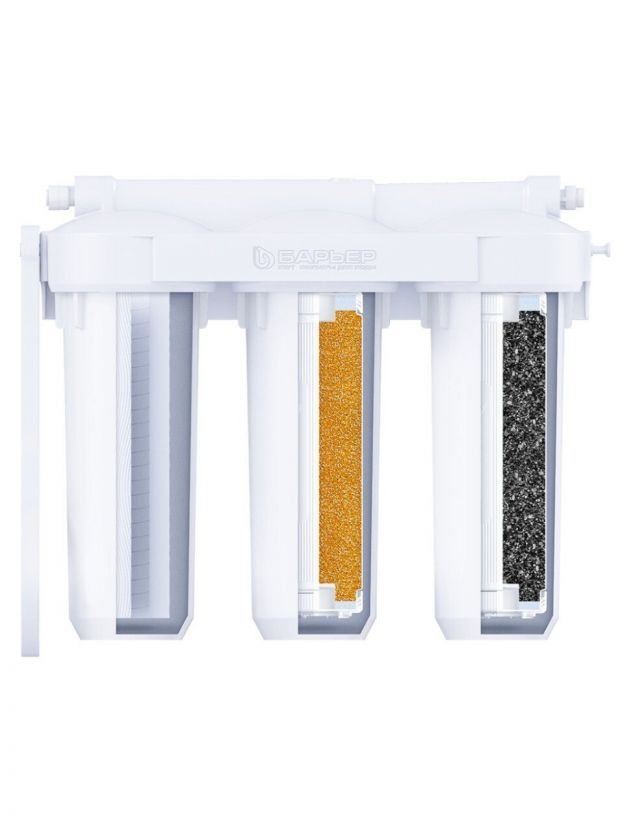 • 3-я ступень - "Барьер Профи ПостКарбон". Финишная очистка. Ионообменное волокно очищает воду от железа, ионов тяжелых и токсичных металлов. Гранулированный активированный уголь, обработанный серебром, устраняет неприятные запахи, улучшает вкус воды.