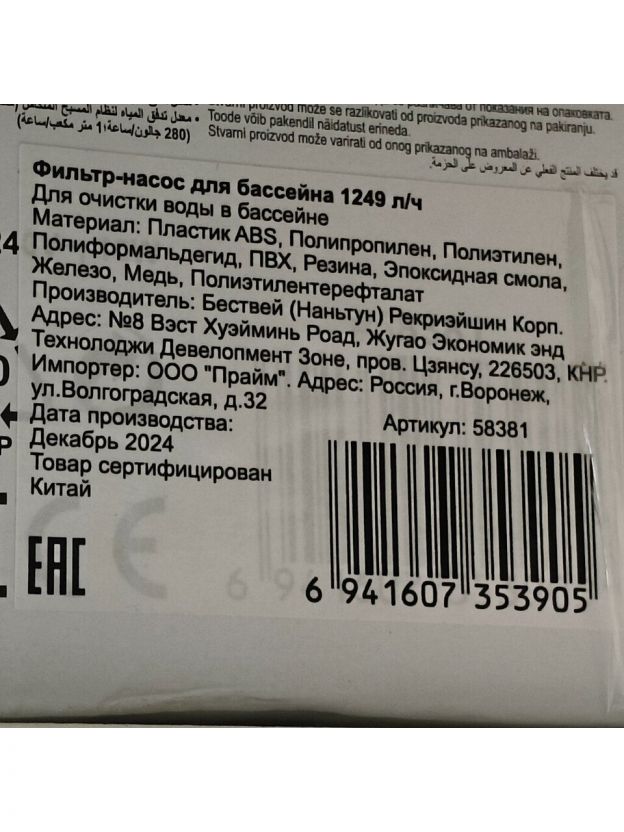 Фильтр-насос для бассейна 1249 л/ч, подходит картридж 58093, Bestway, 58381BW
