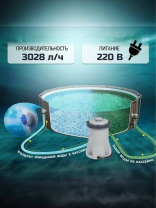 - Высокая производительность: фильтр-насос способен обрабатывать до 3028 литров воды в час, обеспечивая быстрый и качественный результат.