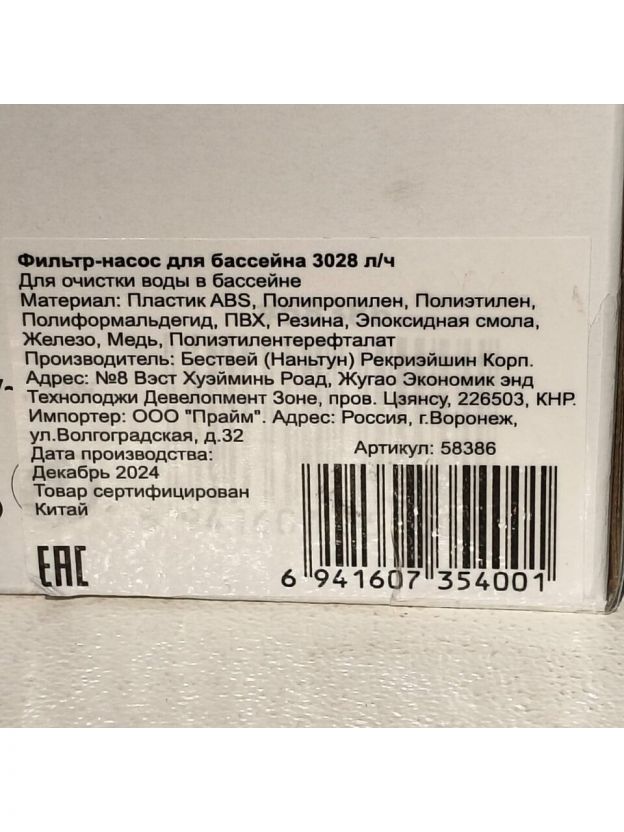 Фильтр-насос для бассейна 3028 л/ч, подходит картридж 58094, Bestway, 58386BW