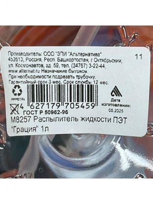 Флакон с распылителем Альтернатива, 1 л, пластик, Грация, М8257, в ассортименте