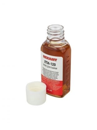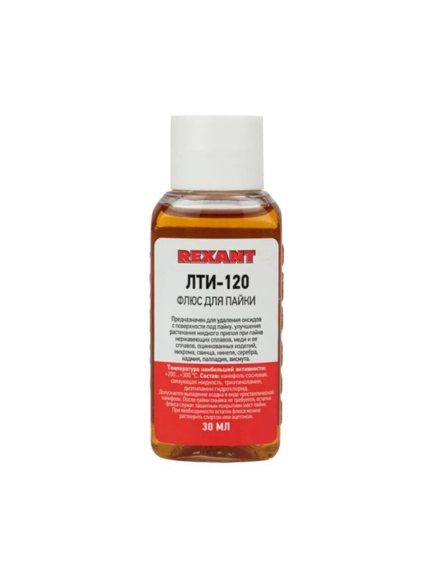 Флюс для пайки REXANT ЛТИ-120, 30мл — идеальный выбор для качественной пайки печатных плат и радиоаппаратуры. Не проводит ток, не требует отмывки после пайки, эффективно удаляет оксиды с поверхности. Состав: канифоль сосновая, связующая жидкость, триэтаноламин, диэтиламин гидрохлорид. Температура наибольшей активности: +200...+300°С. Применяется для создания надежных и чистых соединений.