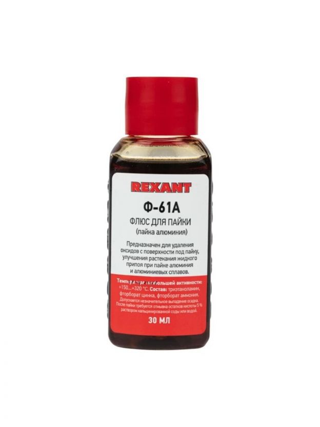 Флюс для пайки REXANT, Пайка алюминия, 30 мл — надежное решение для качественного соединения алюминия и алюминиевых сплавов с медью и сталью. Обеспечивает прочное сцепление при пайке припоями на основе олова, цинка или цинка и кадмия. После пайки остатки легко смываются водой или 5% раствором кальцинированной соды. Температура активности +150...+320°С. Состав: триэтаноламин, фторборат цинк и фторборат аммоний.