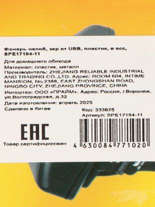 Фонарь заряжается через USB-кабель от любого совместимого устройства — пауэрбанка, ноутбука или адаптера. Зарядка от сети 220 В не предусмотрена.