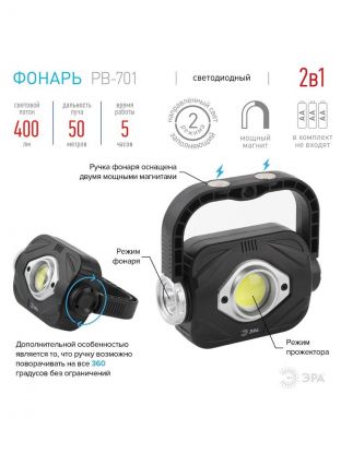 Фонарь ручной, Эра, ЭРА PB-701, пластик, с ручкой на магните, 3 Вт, Б0052316