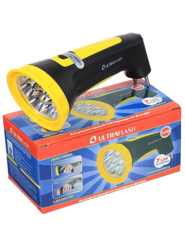 Фонарь ручной, встроенный аккумулятор, Ultraflash, 3807M, зарядка от сети 220 В, пластик, черно-желтый, 12868