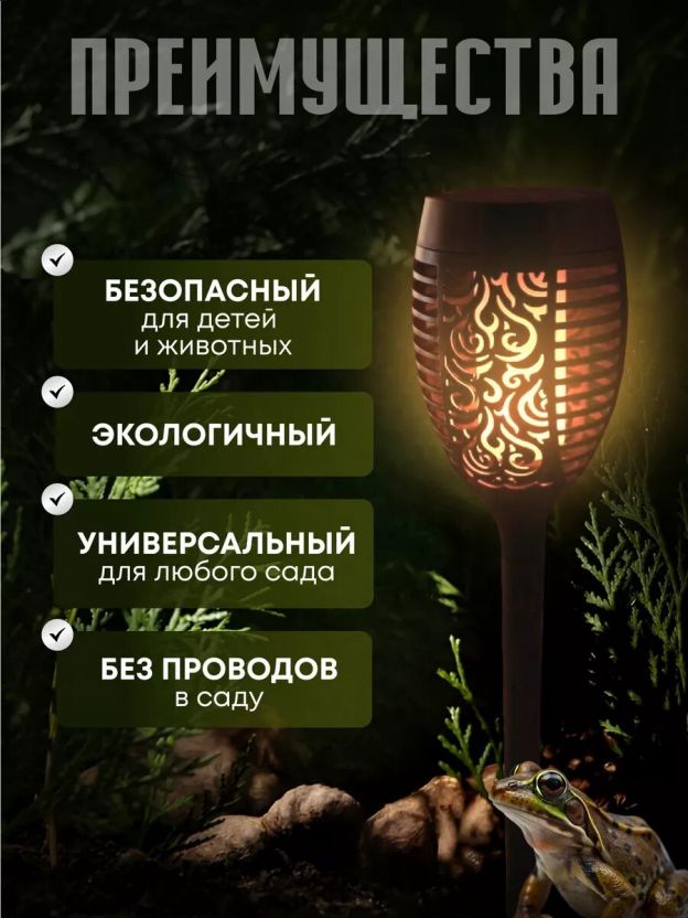 Cветильник на солнечной батарее (солар) нового поколения. Данная модель создана для украшения Вашего приусадебного участка, дачи. Кроме стильного внешнего вида солара, Вам обязательно должен понравится эффект горящего пламени, который появляется при наступлении сумерек. Солнечная батарея светильника заряжается весь день, а с вечера "факельное пламя" светодиодов уже готово радовать Вас своим свечением.