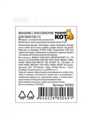 Фонарик с контейнером для пакетов Рыжий кот — удобное решение для дома, дачи и прогулок. Компактный размер 10.8х4 см позволяет легко носить аксессуар с собой. Материал: PP, полиэтилен, что гарантирует прочность и легкость. В комплекте 15 пакетов и батарейки 3хLR44, не требуется дополнительных покупок.