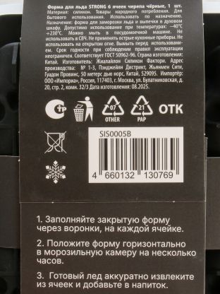 Размер формы — 13.5х13.5х5 см, в комплекте 6 ячеек в виде черных черепов. Компактно помещается в морозильник, каждая ячейка объемная для крупных кубиков.