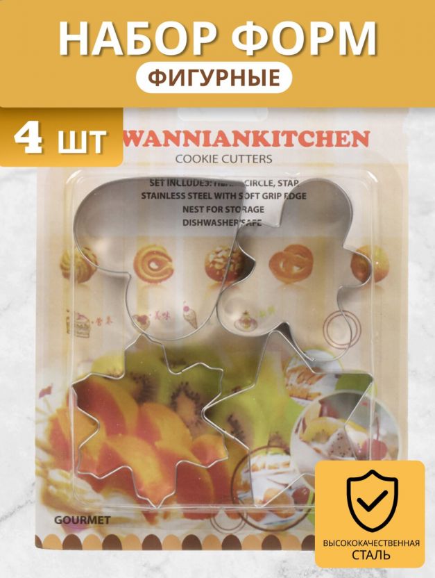 Набор включает четыре разных фигурных формы, что позволяет делать разнообразную выпечку для любого случая и экономит время на поиске отдельных резаков.
