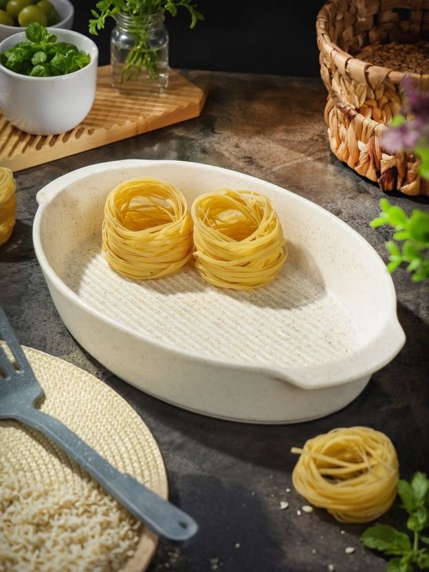 Керамика равномерно прогревается, не выделяет запахов, дольше держит тепло и не боится царапин. Рифленое дно обеспечивает легкое отделение блюда и красивую корочку.