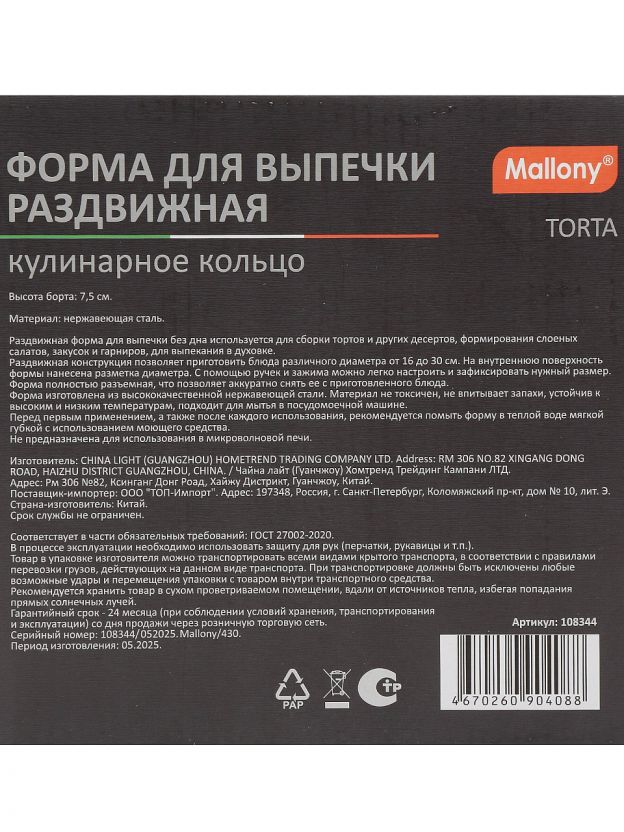 В отличие от дешёвых аналогов из алюминия или пластика, раздвижное кольцо Mallony не деформируется при высокой температуре и не впитывает запахи. Часто задают вопрос: «Подходит ли такая форма для духовки?» — да, изделие специально разработано для выпекания в любой стандартной духовке. Если вы ищете, что лучше для выпечки на даче или в подарок, обратите внимание на универсальность этой модели: она занимает минимум места и заменяет сразу несколько форм разного диаметра.