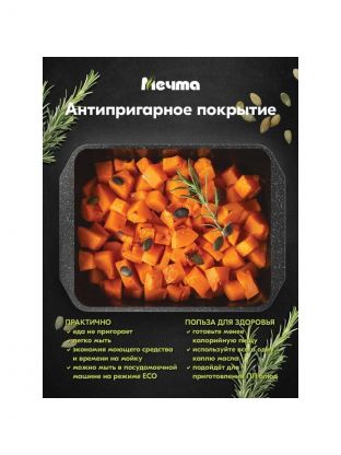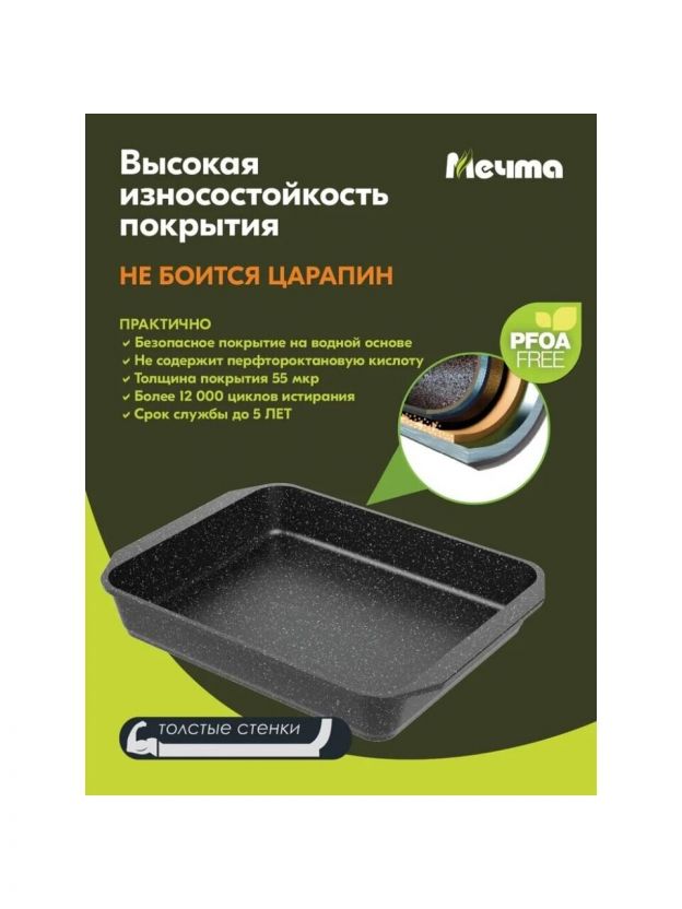 Форма для запекания из алюминия Мечта Гранит black — это выбор пользователей, которые ищут, какую форму для запекания купить недорого для дачи или дома. Покрытие последнего поколения защищает от пригорания, не требует дополнительной смазки, что особенно важно при приготовлении диетических блюд. Благодаря термостойкости алюминия и оптимальной толщине стенок, тепло распределяется равномерно — ваши пироги, запечённая курица или рыба всегда пропекаются до идеальной корочки.