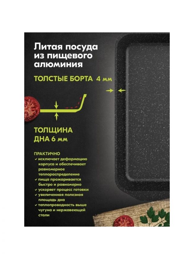 Форма для запекания из алюминия Мечта Гранит black — это выбор пользователей, которые ищут, какую форму для запекания купить недорого для дачи или дома. Покрытие последнего поколения защищает от пригорания, не требует дополнительной смазки, что особенно важно при приготовлении диетических блюд. Благодаря термостойкости алюминия и оптимальной толщине стенок, тепло распределяется равномерно — ваши пироги, запечённая курица или рыба всегда пропекаются до идеальной корочки.
