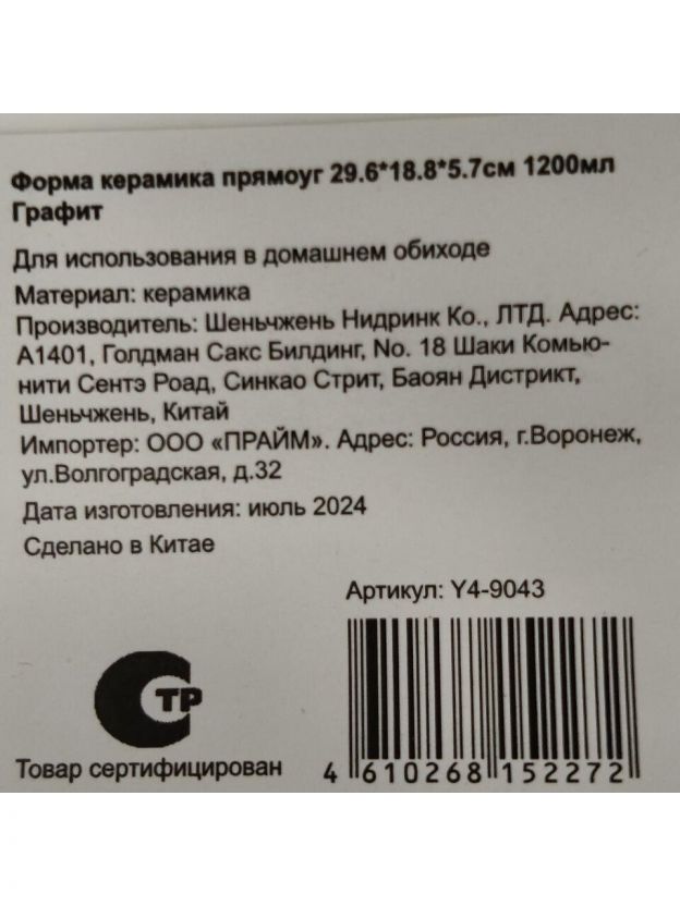 Длина — 29.6 см, ширина — 18.8 см, высота — 5.7 см, объём — 1.2 литра. Идеально для запекания порционных блюд или гарниров на 2-4 персоны.