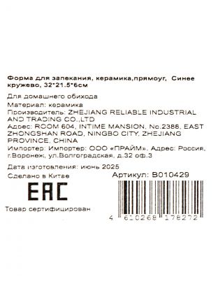 Форма для запекания керамика, 21.5х32х6 см, прямоугольная, Синее кружево, B010429
